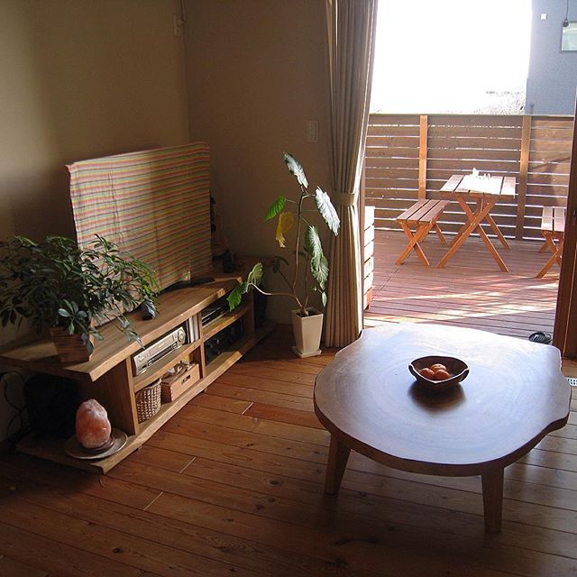 家のフローリングや梁になじむ木材を使用したテレビボードを使ったインテリアには、少しグリーンをアクセントに効かせると、よりナチュラルで居心地の良い空間になります。