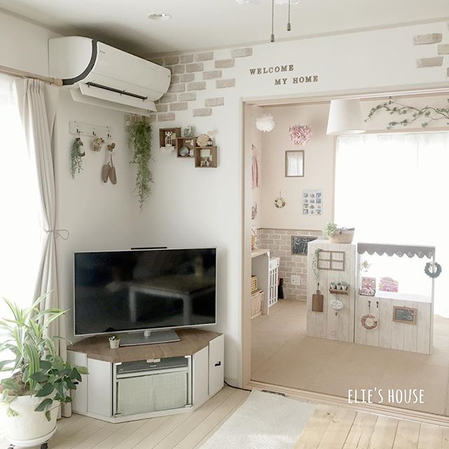 こちらも、テレビを設置する壁に白いレンガ調のアクセントウォールを使用しています。