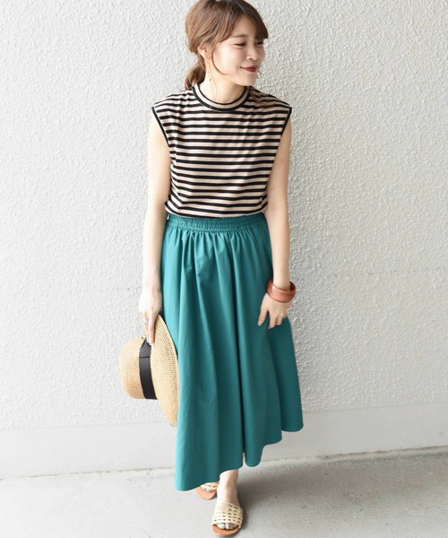 膨張して見えがちなボーダーはニュアンスのあるベージュ系のノースリーブをセレクトし、上半身をコンパクトにまとめるのがおすすめです。