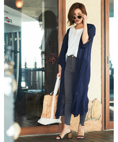 シアーなロングカーディガンでふんわりと女性らしさをプラスした、優し気な印象のコーデです。