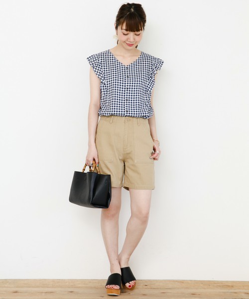 ギンガムチェックを大人女子が着るなら断然ネイビーがおすすめ。ハーフパンツに合わせても、大人っぽさをキープすることが出来ます。