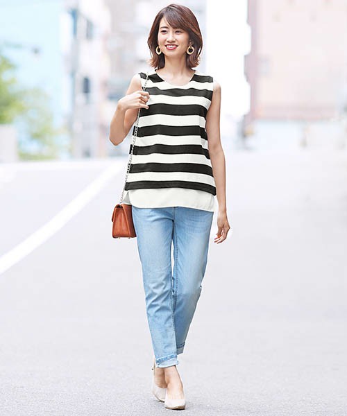 レイヤードデザインを取り入れた旬感度の高いトップスは、ブラックのワイドボーダーが定番デニムスタイルをワンランクアップ。