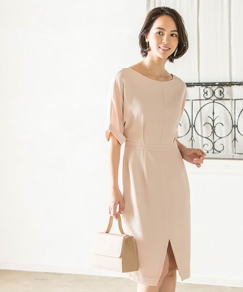 ピンクベージュ色がパッと目を引くAラインのワンピース。