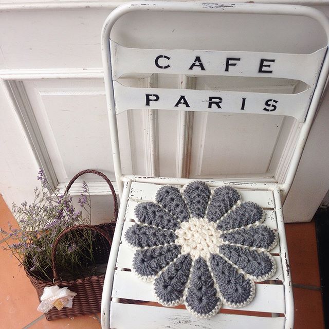 ガーリーなお花モチーフの円座は、白×グレーでオシャレな印象に。アンティーク感のあるチェアと組み合わせて、カフェテイストのインテリアを演出しています。