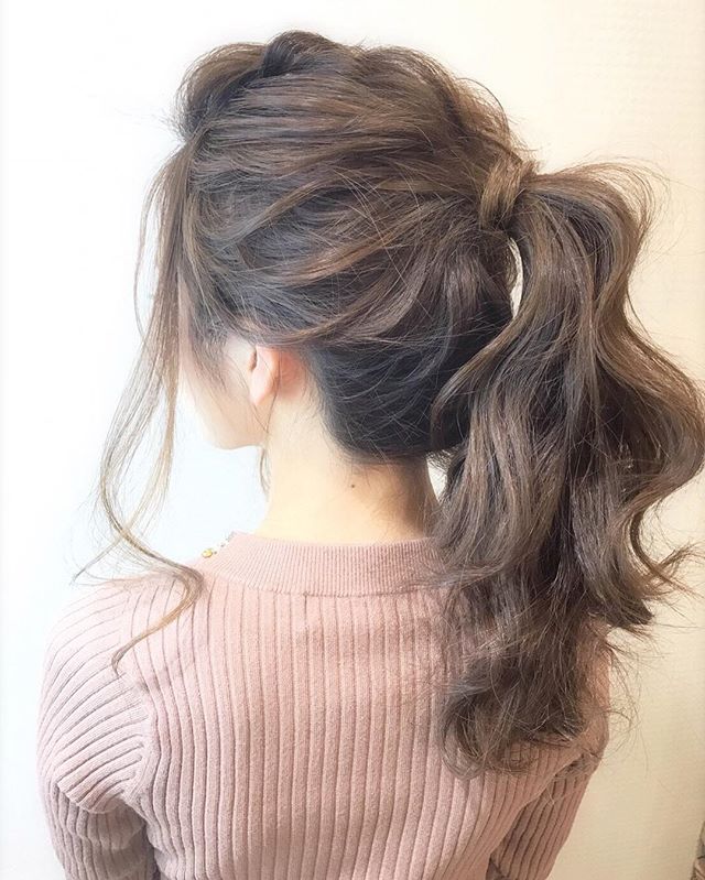 ロングヘアなら、全体を軽く巻いてからポニーテールに結びましょう。