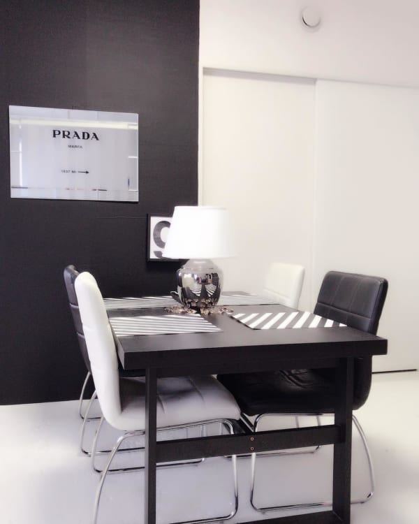 こちらのお部屋では、シンプルに黒と白でまとめつつ、斜めストライプのランチョンマットを取り入れています。