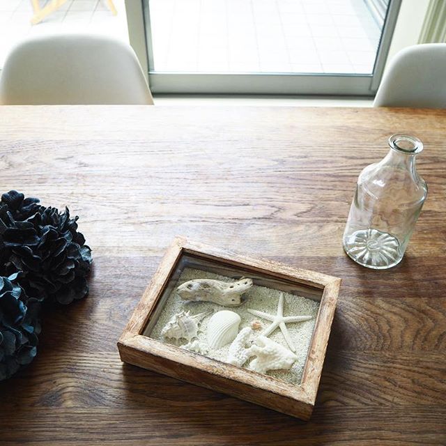 貝殻や流木などを詰め込み、爽やかなテイストの雑貨にしています。