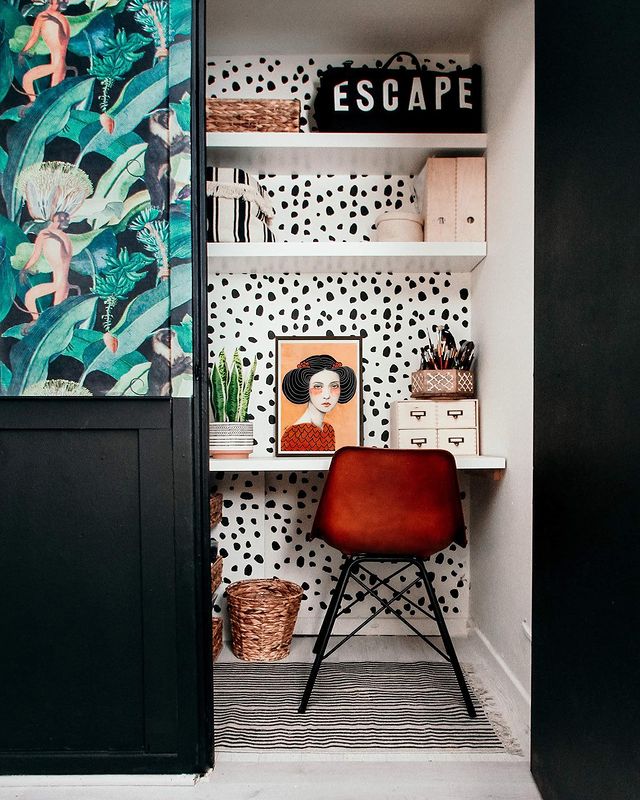 ポップなダルメシアン柄の壁面いっぱいに作りつけられた棚板シェルフは、四角形を意識したディスプレイ収納が実現されています。