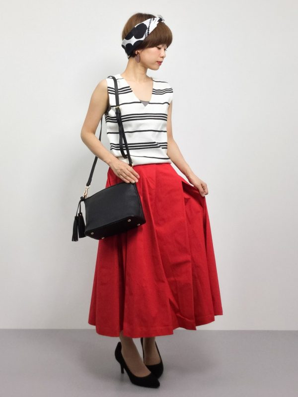 先ほどと同じレッドカラーのスカートを使った別コーデバージョン。パンプスと合わせて、レディライクなスタイルに。ボーダーのトップスはVネックで、シャープさを!ヘッドリボンは、ドットでキュートさを!レッドカラーと相性の良い、柄を組み合わせることで、センスアップしていますね。