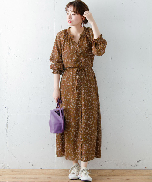 ナチュラルカラーがベースになった流行りのワンピースに、小さめのドット柄を施して可愛らしさをプラス。