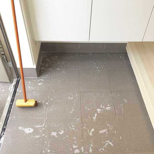 やり方はオキシクリーンと60度のお湯を混ぜたものを、玄関のタイルに流して、デッキブラシでこすります。