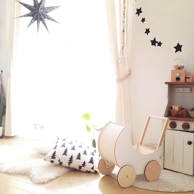 木でできた手押し車やおままごとキッチンが、優しく穏やかな温もりを演出してくれていますね。
