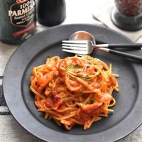 トマトの水煮ベースが好みではない子供にはトマトケチャップを使って、いつものご家庭のナポリタン風の料理法でも構いません。
