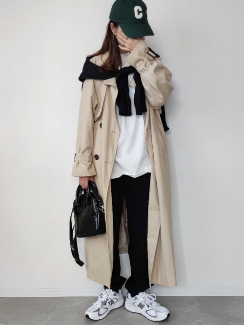 スポーティなスニーカーと合わせたコーディネートですが、アウターをトレンチコートにしていることでラフになりすぎるのを防げていますね。