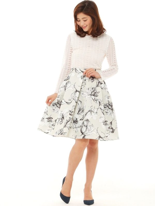 薄いグレーを基調としたフラワープリントのスカートに、ホワイトカラーのトップスを。全体的に薄めのコーデなので、足元はネイビーのパンプスでバランスを取って。