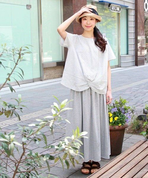リラックス感たっぷりのスウェットマキシは普段着にぴったり。トップスにブラウスを持ってくればちょっとしたお出かけもできちゃいます。麦わら帽子と健康サンダルで夏らしく、過ごしやすいコーデに。