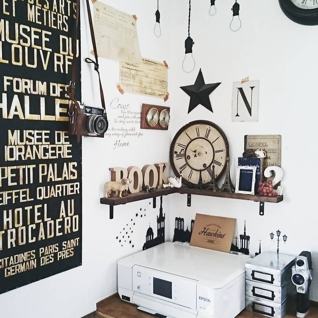 部屋に馴染まない電化製品はどうやって隠そうか悩みどころですが、あえて隠すのをやめてプリンターの上に何も置かないようにしたそうです。まわりのモノクロのインテリアとマッチして違和感がありませんね。隠すことより、インテリアとどうアレンジするかがポイントですね。