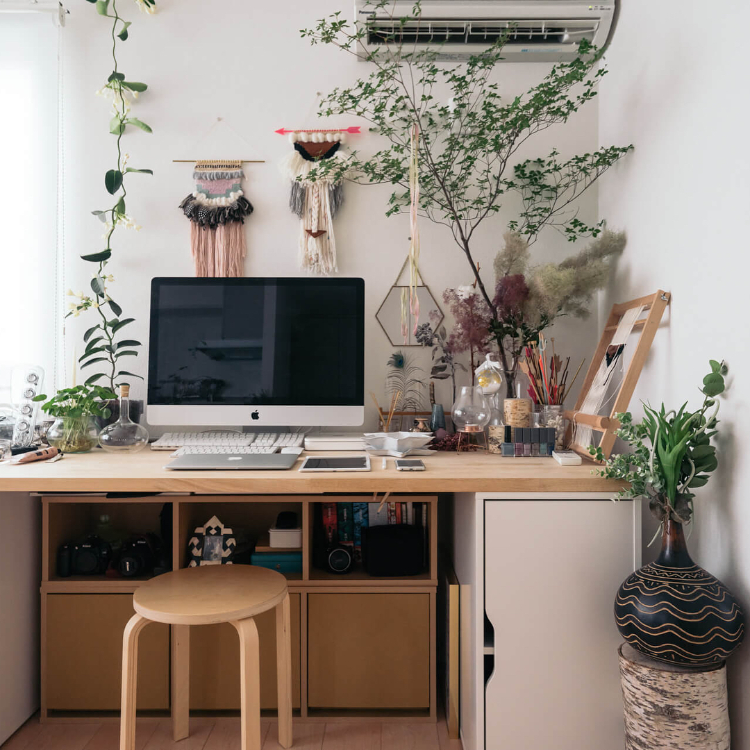 シンプルなデスクの周りに、表情豊かなグリーンが楽しい空間を作っていますね。無駄をなくし機能的なデスクだけでも十分素敵な空間が作られています。