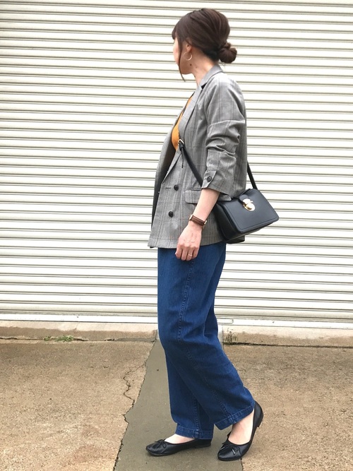 この秋流行のグレンチェックのテーラードジャケットにデニムを合わせたスタイル。足元はバレエシューズでフェミニンに仕上げて女性らしさをプラスしました♪アダムエロペのショルダーバッグも可愛らしい!