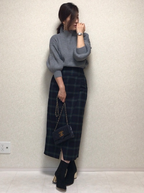 ヒール部分がゴールドになったショートブーツは、はくだけでゴージャスな印象に♡可愛いチェックスカートもタイトでロングなシルエットをチョイスして大人感UP!