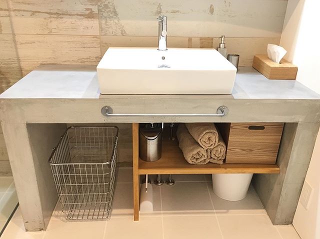 シンプルモダンな洗面所のシンク下収納です。タオルの畳み方や木目調のボックスがおしゃれですね。