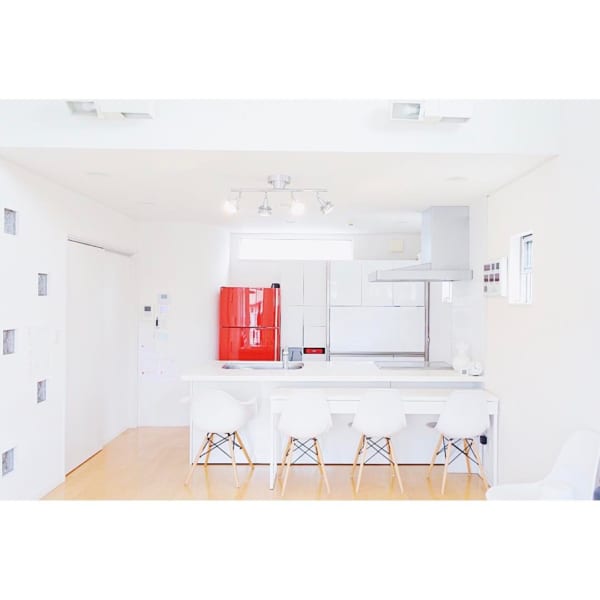 こちらもホワイトを基調としたペニンシュラキッチンですが、冷蔵庫は目を引くレッドをチョイス。